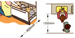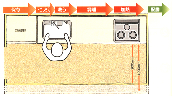 台所の作業の動きが最少になるようなレイアウトを心がけ、安全のために動くスペースにはゆとりをもたせることが大切です。