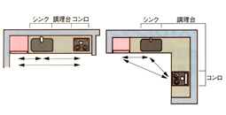 I型に比べてL型は動線が短くなりますが、より広いスペースが必要です。