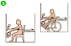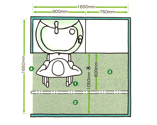 洗面器前のA寸法を1050mm以上取ると いすや車いすでも洗面器使用が 可能になります。 |