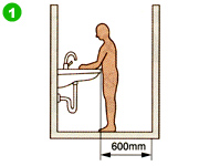 | 洗面器前のA寸法は立位で使用 する場合、600mm以上必要です。 |